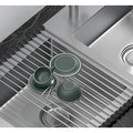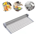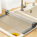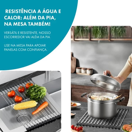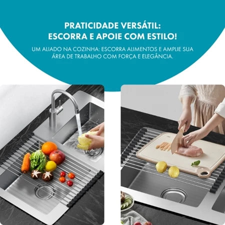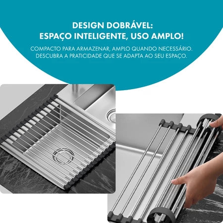 O FlexSpace Drain™ resolve o problema: Suas hastes de **Aço Inox ultra-resistentes**, envolvidas em silicone de grau alimentar, desenrolam-se sobre a sua pia, usando o espaço aéreo que você já tem! É **antiderrapante**, suporta até 15kg e é 100% resistente à ferrugem.