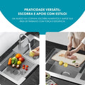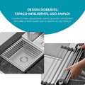 Chega de comprometer o espaço. O FlexSpace Drain™ é o segredo das cozinhas de revista. Ele só existe quando você precisa, e desaparece quando não. Prepare-se para dobrar o espaço da sua bancada instantaneamente!